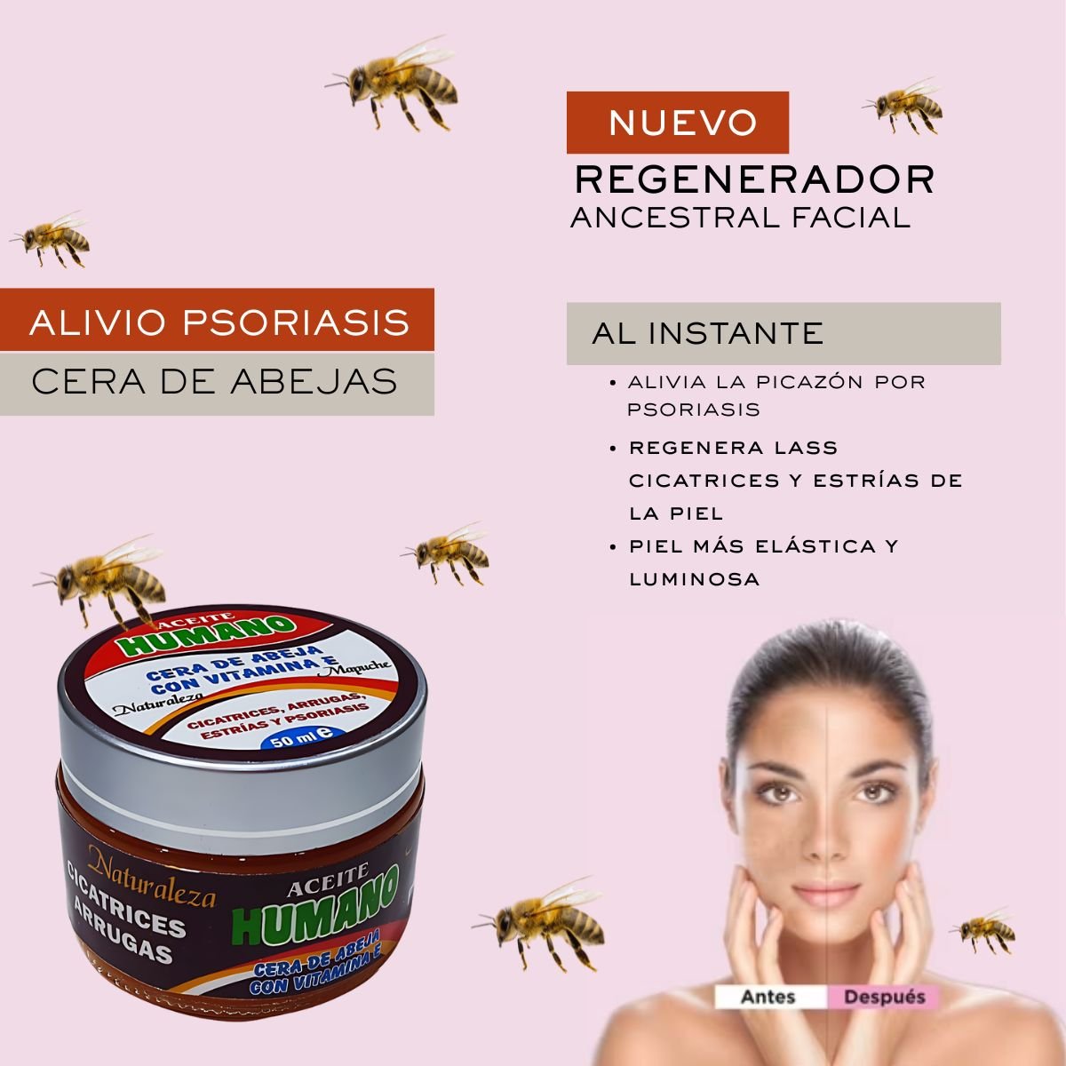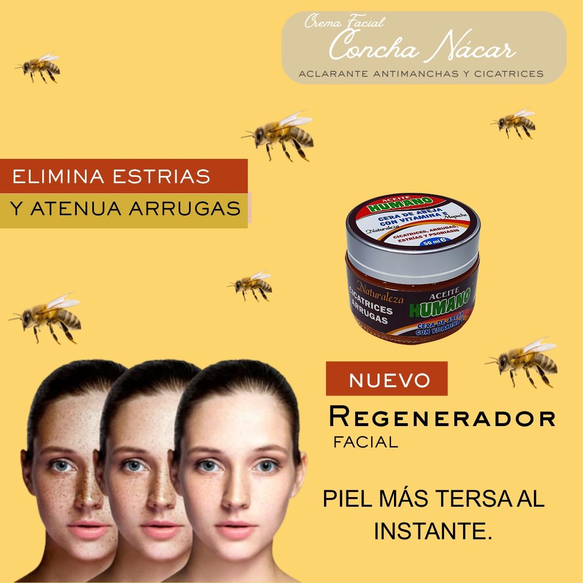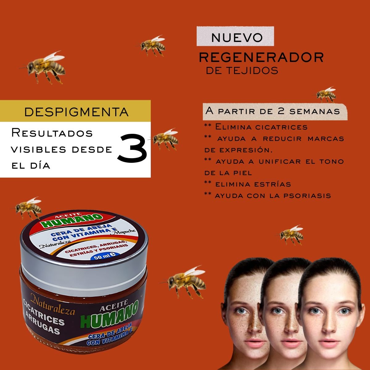 Es un Regenerador Ancestral Facial diseñado para mejorar la textura de la piel y tratar condiciones específicas de los tejidos. Se presenta en un envase de 50 ml y promete resultados visibles de despigmentación a partir del tercer día.