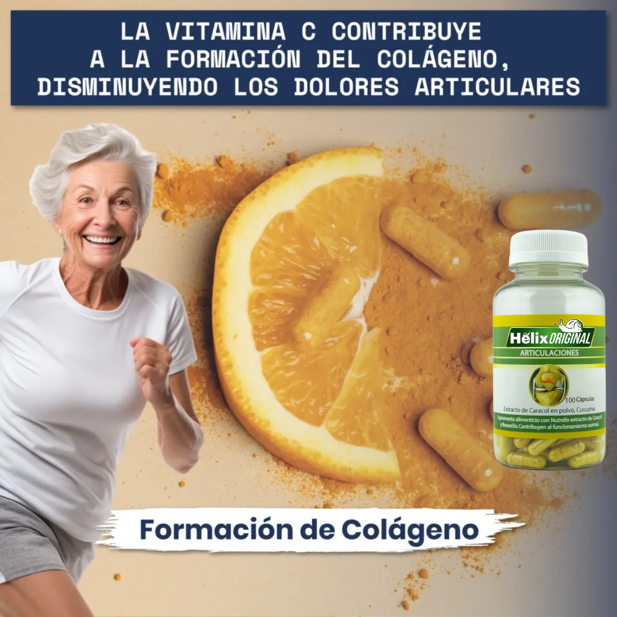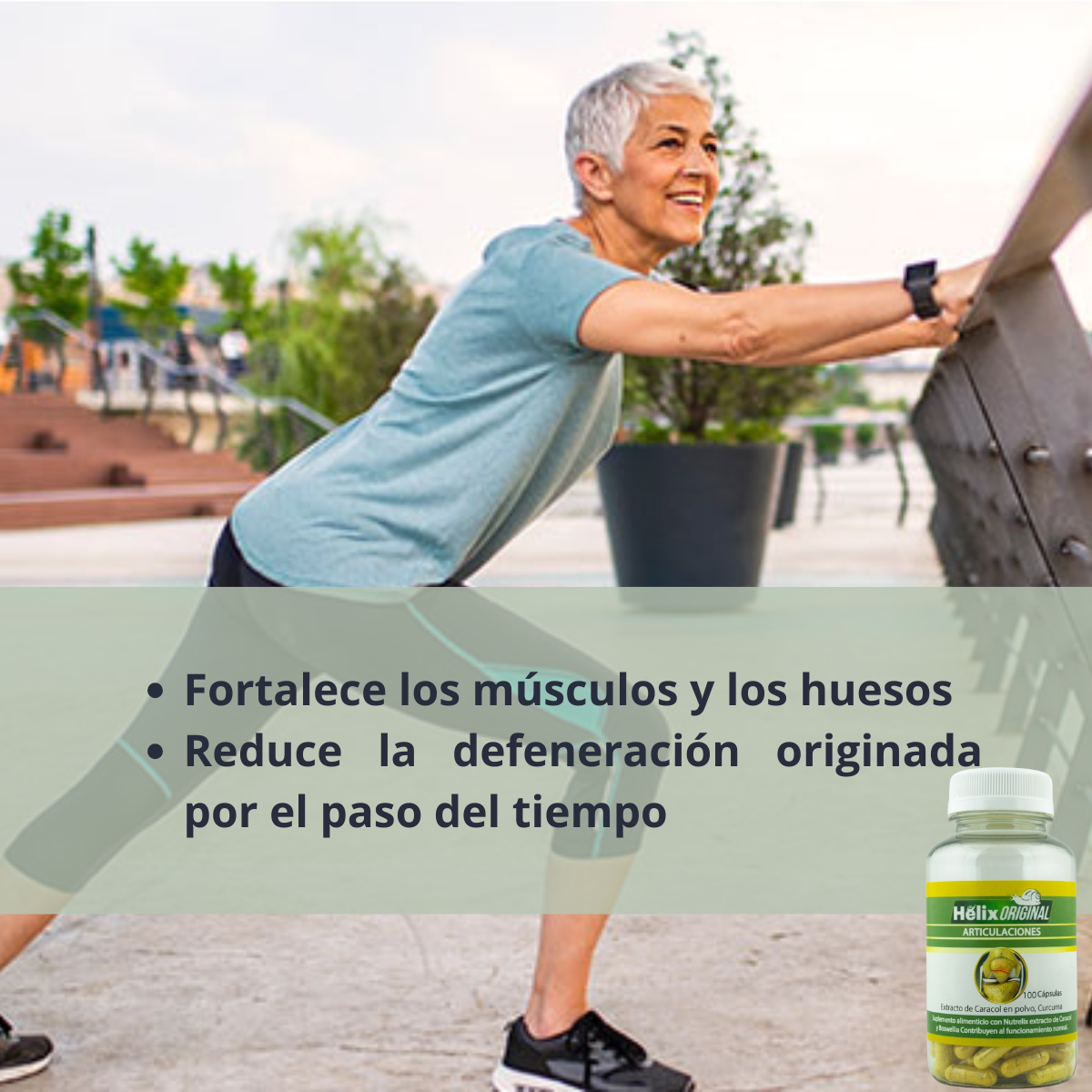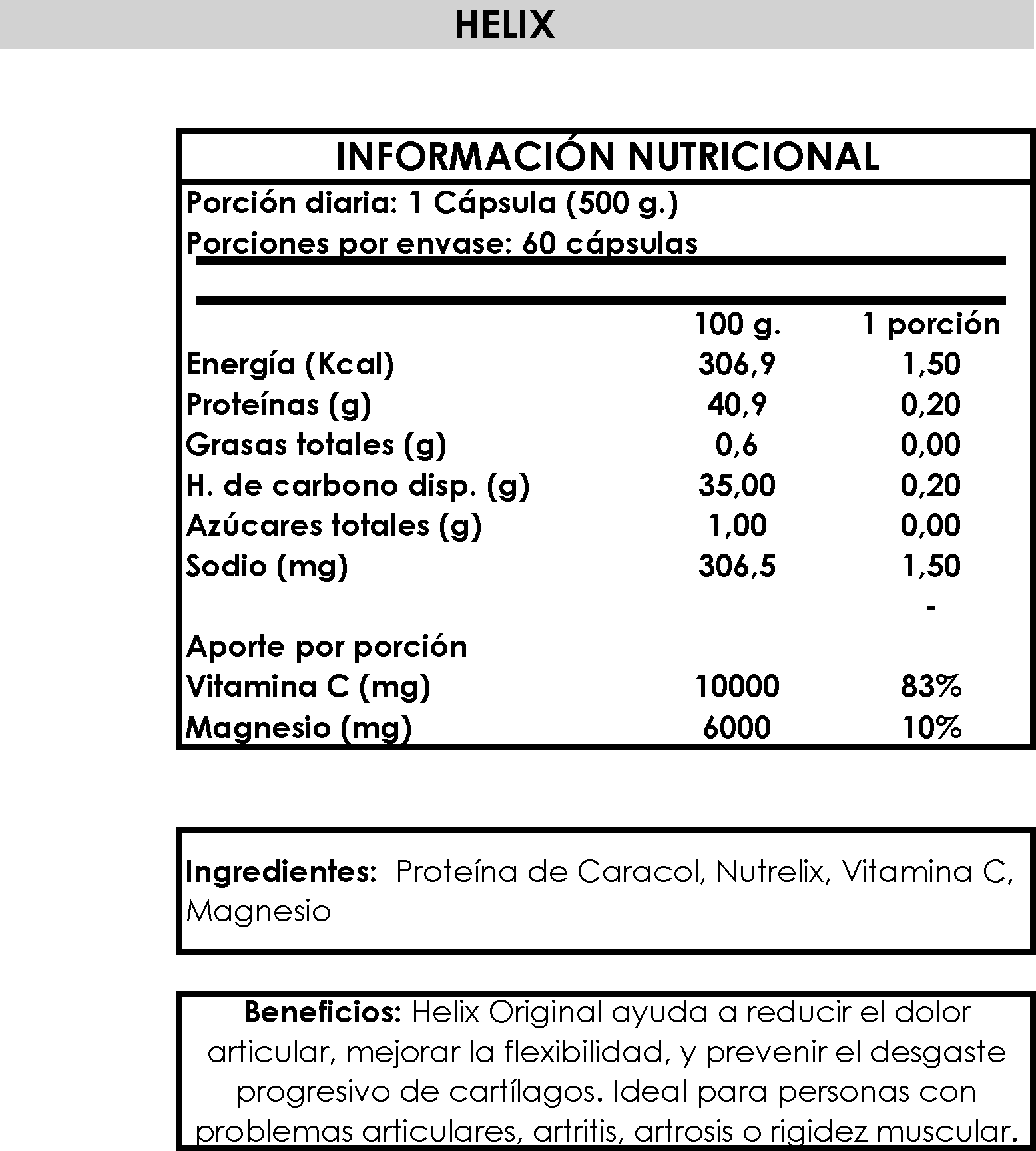 Gracias a su innovadora fórmula, Helix Original ayuda a reducir el dolor articular, mejorar la flexibilidad, y prevenir el desgaste progresivo de cartílagos. Ideal para personas con problemas articulares, artritis, artrosis o rigidez muscular. Además, fortalece huesos y tendones desde el interior.