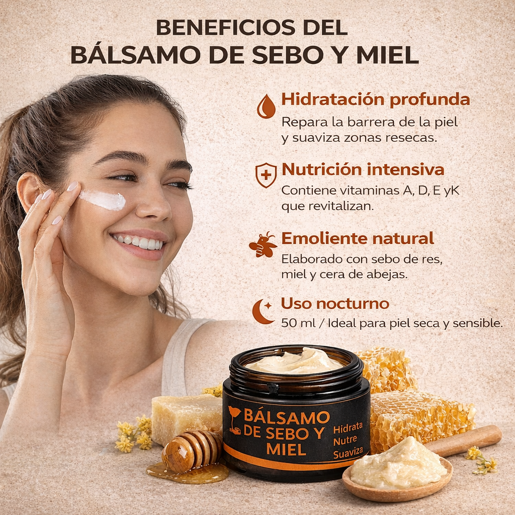 ¿Qué es y para qué sirve? Es un tratamiento nocturno de nutrición biomimética diseñado para restaurar las pieles más exigentes. A diferencia de las cremas convencionales, este bálsamo utiliza sebo bovino de pastoreo, cuya estructura molecular es casi idéntica a la de la piel humana. Esto permite una absorción profunda de vitaminas y ácidos grasos esenciales que reparan la barrera cutánea desde el interior, siendo el aliado definitivo para pieles secas, maduras o sensibles. Beneficios Principales Regeneración Profunda: Rico en vitaminas naturales A, D, E y K, que aceleran la curación de tejidos y suavizan cicatrices o estrías. Alivio Dérmico:…